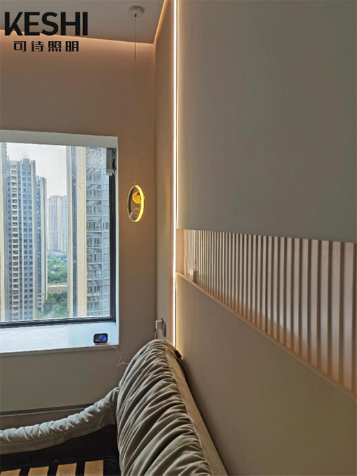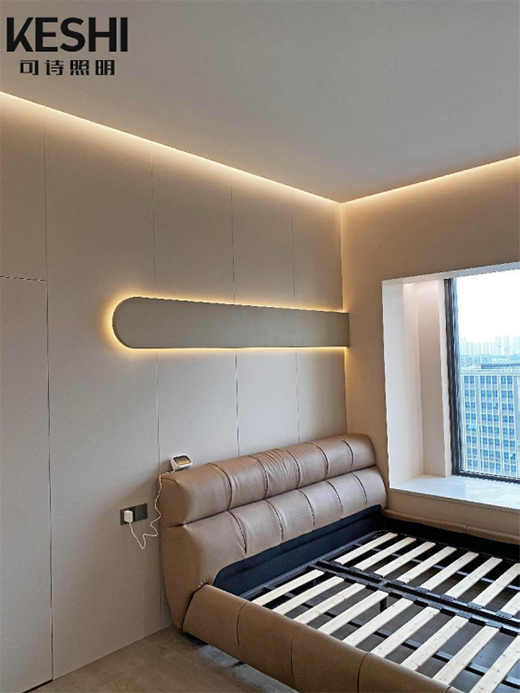 在次臥燈光細節設計上,又各具特色。比如女兒房的床頭背景墻應用了柔性燈帶,營造成曲線型發光效果,柔美感更強。男兒房的立面墻安裝上明裝線性燈,打造出視覺上更強的立體效果。客房則采用了設計感更強的長條吊燈,為整體簡約空間錦上添花。