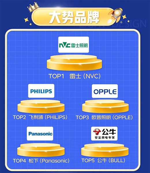 其中,“12.16燈飾品類日”之“大勢品牌榜單”顯示,雷士照明實力登頂第一,飛利浦位列第二,歐普照明排名第三,松下排在第四,而公牛則排在第五。