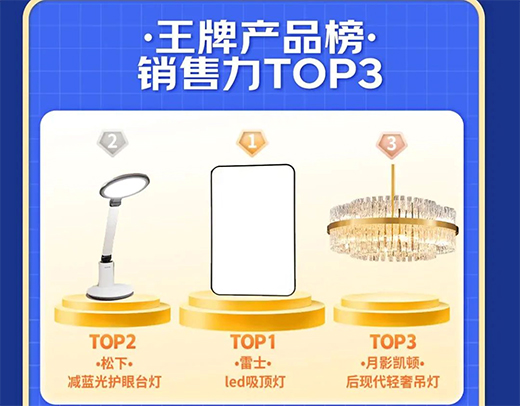 “王牌產品榜·銷售力TOP 3”分別為:雷士LED吸頂燈、松下減藍光護眼臺燈、月影凱頓后現代輕奢吊燈;