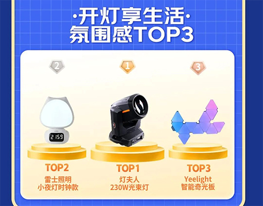 “開燈享生活·氛圍感TOP 3”分別為:燈夫人230W光束燈、雷士照明小夜燈時鐘款、Yeelight智能奇光板。