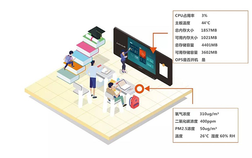 管理員通過物聯功能接入環境監測傳感器后,就可以在小程序上和黑板使用數據一起,監看環境信息了。顯示的數據包括空氣濕度、溫度、含氧量、PM2.5污染程度等,隨時掌握學習環境。