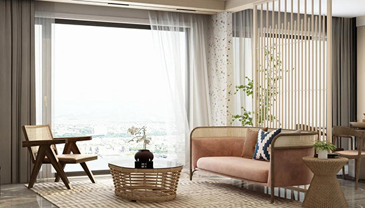 從玄關步入室內,大面積木飾面的裝修設計賦予空間極大的侘寂感,日系屏風極具特色,簡約具有設計感的線條、藤編的茶幾營造出空靈、自然、愜意的氛圍。