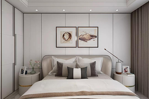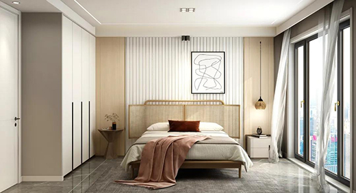 臥室用色統一、簡約大氣,原始材質的家具讓生活回歸純真簡約。日系燈光輕易便營造出自然氛圍。床頭從幾何線條和自然元素中汲取靈感,不經意間流露出簡約之美。