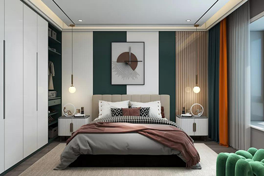 臥室選用了經典的愛馬仕橙搭配純凈的墨綠色,一個清新一個時尚,亮眼卻不夸張。墨綠色的背景墻、窗簾與小沙發的加入為空間注入了一抹生機與靈動,但讓人意外的是墨綠色窗簾銜接的愛馬仕橙竟別有深意,濃烈的愛馬仕橙,讓原本靜謐的空間又多了一絲溫度。享受生活,忠于自己,從好看的家開始。