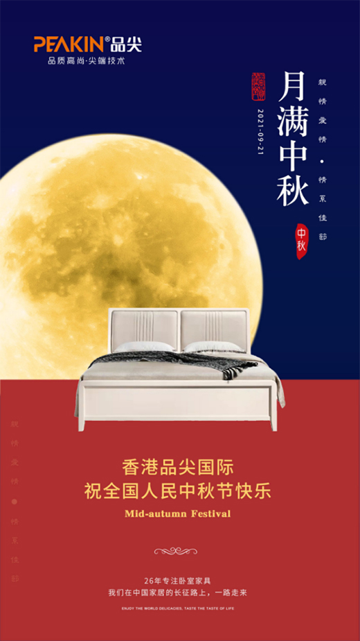 “但愿人長久,千里共嬋娟”,品尖床墊予你與家人在這花好月圓夜一夜好眠,值此佳節(jié),品尖家具祝大家中秋快樂,闔家歡樂,萬事順意,好夢常圓!