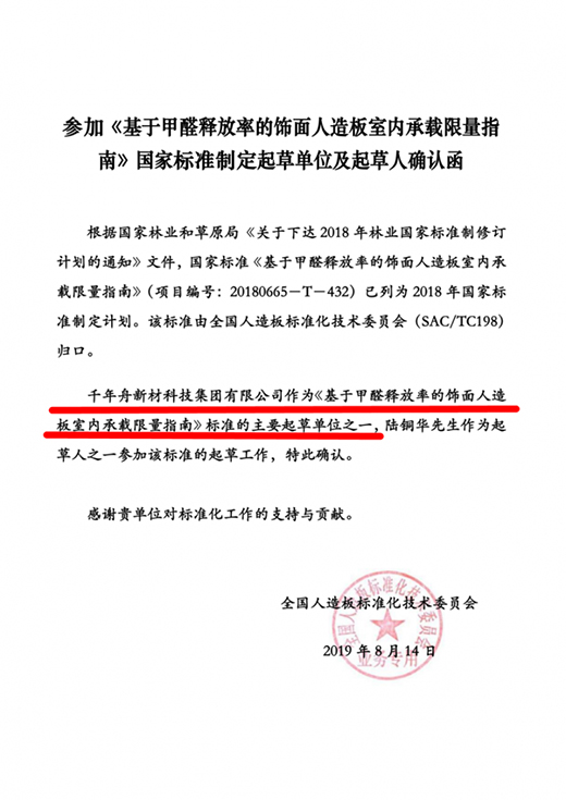 在2018年,千年舟就成功研發生產出企業標準無醛級板材——天然豆香生態板,板材甲醛釋放量≤0.018mg/m3,也就是說,這個數據優于新國標ENF級(≤0.025mg/m3)