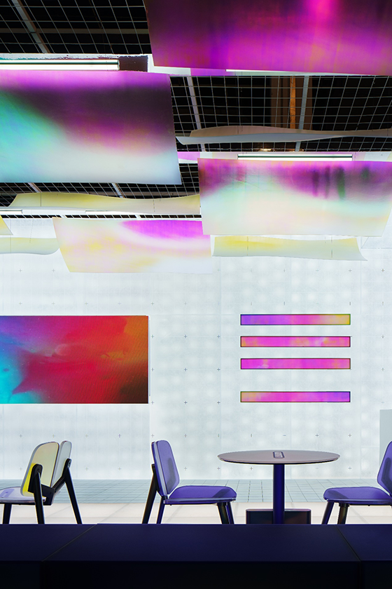 另一主題館《第五元素》,是一場有關外太空的神話色彩碰撞,淋漓盡致地詮釋了DECO·DECO樹脂玻璃的創新應用。涵蓋了墻面、地面、吊頂、成品桌椅、藝術裝置等。應用范圍廣,可塑性高的樹脂玻璃為觀眾帶來耳目一新的感覺。
