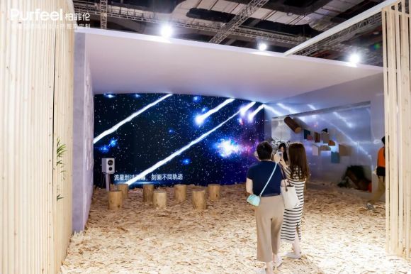 從一棵樹到一塊板材,再到一個家,柏菲倫打造定制家居整套綜合解決方案,把健康美好家搬進了展廳。現場人頭攢動,絡繹不絕,觀眾在柏菲倫精心準備的三維動畫前驚嘆柏菲倫金屬漆工藝的精巧絕倫;在星朗家居打造的家居空間中感受時空浪漫,對此“心靈療愈島”流連忘返。
