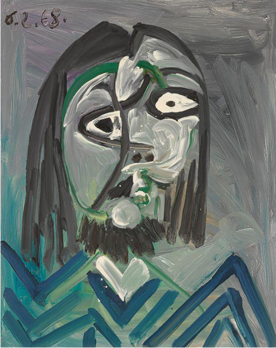 畢加索于1968年創作的《男子胸像》(Buste d’homme,估價:150萬至250萬英鎊)充滿了他創作生涯最后十年的創造力與活力。畢加索1960年代的許多作品可被視為他與所敬仰的西洋古典油畫大師們之間的對話,藉此確認自己在藝術傳承中的地位。他在此時期創作的男性形象,實際上是隱晦的自畫像——這些視覺符號讓他得以探尋自身的身份認同、創作傳承以及逐漸增長的年齡。保琳于1984年6月從約拉斯處購得《男子胸像》。