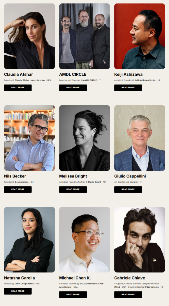 本屆賽事評審團堪稱"設計界的全明星陣容",匯聚43位全球創意領袖。涵蓋建筑、室內、藝術與可持續發展領域。國際評委包括(列舉部分):