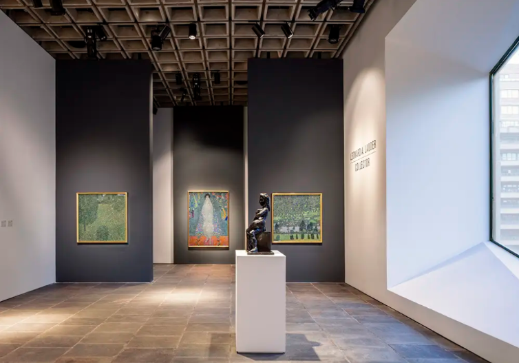 蘇富比四樓布魯爾展廳展出古斯塔夫?克林姆(Gustav Klimt)之《繁花草甸》(Blumenwiese)、《伊麗莎白?萊德勒肖像》(Portrait of Elisabeth Lederer) 及《阿特湖翁特拉赫的林坡》(Waldabhang bei Unterach am Attersee),出自李奧納德?A?蘭黛珍藏(The Leonard A. Lauder Collection)[由左至右]