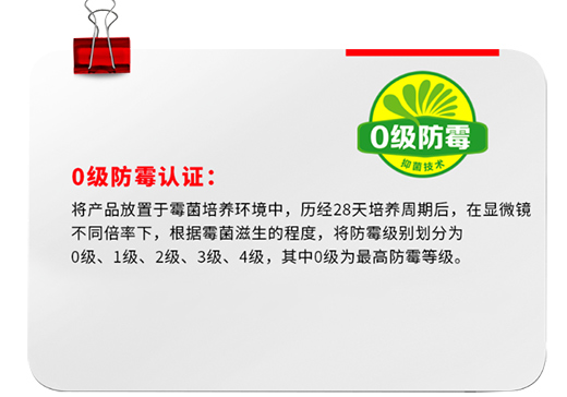 0級(jí)防霉認(rèn)證需模擬8種自然界霉菌生長(zhǎng)的環(huán)境條件(黑曲霉,黃曲霉,出芽短梗霉,綠色木霉,臘葉芽枝霉,宛氏擬青霉,球毛殼霉,桔青霉),0級(jí)為最高防霉等級(jí)。