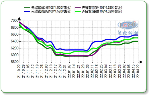 截至4月24日,西南地區磐金產108*4.5mm報價分別成都6350元、重慶6410元、貴陽6530元、昆明6260元,臨沂產108*4.5mm普軋成都6300元、重慶6350元、貴陽6430元、昆明6180元,包鋼產377*10mm報價成都6480元、重慶6450元,貴陽7000元、昆明6570元,以上較上月同期持穩。