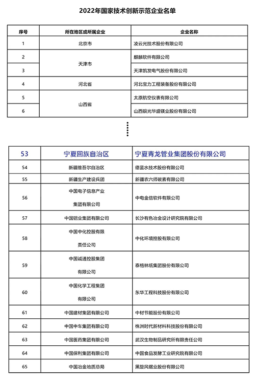 工信部辦公廳近日發(fā)布2022年國(guó)家技術(shù)創(chuàng)新示范企業(yè)名單,寧夏青龍管業(yè)集團(tuán)股份有限公司成功獲評(píng)國(guó)家技術(shù)創(chuàng)新示范企業(yè),是本年度寧夏回族自治區(qū)唯一上榜企業(yè)。