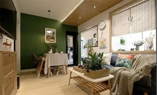 面積雖小,但是各種功能空間卻不能省略。餐廳雖然與客廳處于一個空間,但是我們可以用墻面顏色來區分功能區,這是一個非常好的辦法。餐廳墻選擇充滿生機的綠色,綠色墻面放在這里不僅非常亮眼,而且還能增強客廳的設計感。這樣一面綠色的墻放在這里讓人感覺這個空間變得時尚多變,精致的生活從這里開始,美食也在這里開始。