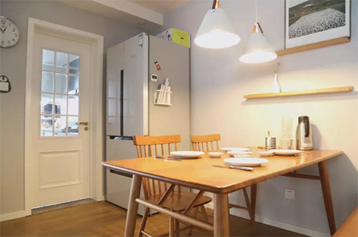 原木色也是北歐風的必備,餐廳用白色貝殼粉墻面搭配簡潔線條原木色餐桌椅,使整個空間干凈利落。