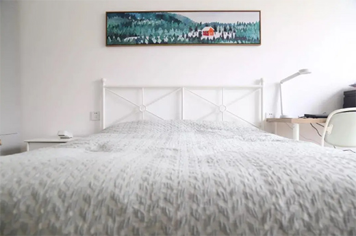 次臥沒做過多的裝飾,墻面用了簡簡單單的白色,搭配白色鐵藝床具,整體看起來時尚干凈。