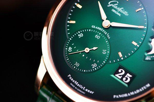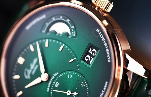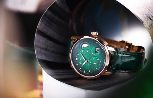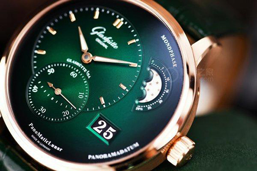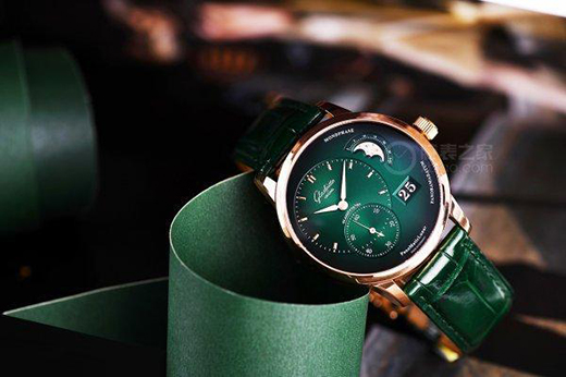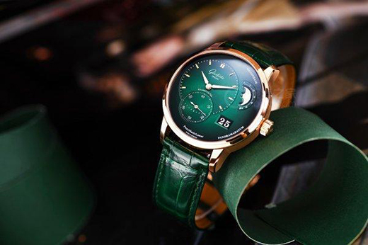 綠色,是生機、是期望,它總是能讓我們想到美好的事物。在制表上,這幾年綠表非常流行,綠色讓腕表呈現出了與眾不同的氣質。這次我們拿到了格拉蘇蒂原創全新的偏心月相腕表紅金款,其實之前格拉蘇蒂原創就已經推出過了兩款不同表帶的精鋼款。作為中國首發,今年的這一款以紅金材質搭配森林綠色表盤,色彩更加鮮明濃烈。