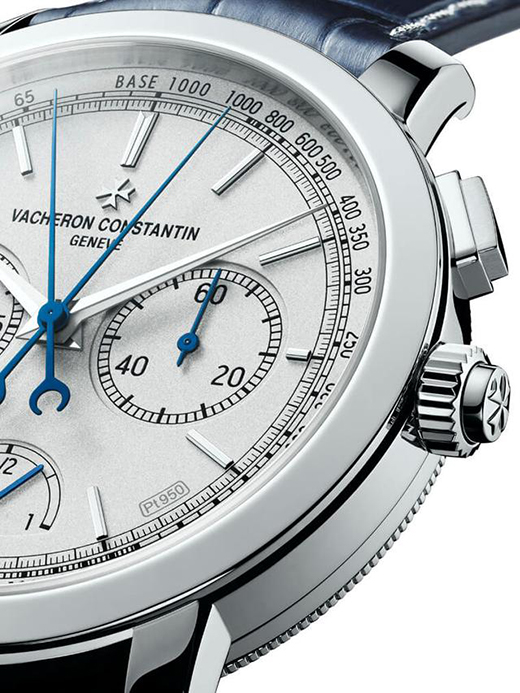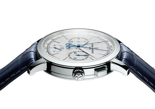 限量鉑金珍藏系列顧名思義表殼都是用珍貴稀有的950鉑金制成,因此Traditionnelle超薄雙秒追針計時碼表從表殼、表圈、面盤、表冠到折疊扣等零件清一色都是鉑金打造的,它的表殼42.5mm大小還是剛剛好,加上手表厚度以追針計時碼表而相對輕薄的10.72mm,佩戴起來的負擔感不會過于沉重。補充一提,表款的藍色鱷魚皮表帶兩側縫線事實上也是鉑金絲線,從這些細節中不難看出手表為何如此珍貴的原因。