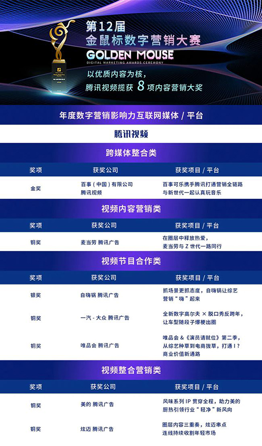 近日,在第12屆金鼠標數字營銷大賽上,騰訊視頻憑借2020年的多個經典IP營銷案例斬獲多枚獎項,體現出這家視頻平臺在內容營銷上的能力。
