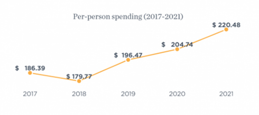 據美國零售聯合會(NRF)數據統計,自2018年起,母親節的支出就在逐年增長。2021年,更是達到了創紀錄的220億美元。到2022年,預期這個數字今年還將繼續上升。
