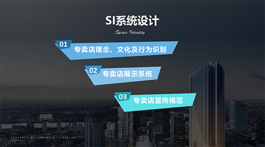 SI(Space Identity),稱為空間識別,也可以把它當作VI的延伸,但主要目的是在“三維空間”、“裝潢規格化”作業,一般包括“專賣店理念、文化及行為識別;專賣店展示系統;專賣店宣傳規范”等三個部分。
