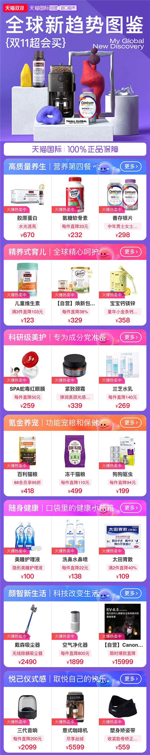 天貓國際進口超市在海量的商品池中,精心挑選了高質量養生、科研級美護、悅己儀式感、顏智新生活、精養式育兒、氪金養寵、隨身健康等七大趨勢品類,覆蓋養生、美妝、育兒、萌寵、黑科技、運動等多個賽道,運用布局全球產業鏈的眼光,將精致的理念融入到生活的方方面面。