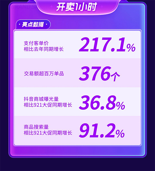 本次抖音雙11好物節(jié)主打抖音商城陣地,站內(nèi)大促氛圍火爆。僅開(kāi)賣1小時(shí),支付客單價(jià)相比去年同期增長(zhǎng)217.1%;抖音商城曝光量相比921大促同期增長(zhǎng)36.8%;商品搜索量相比921大促同期增長(zhǎng)91.2%。