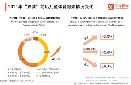 據艾媒咨詢調研數據顯示,“雙減”后,超過半數的兒童(56.0%)平均每天鍛煉時長能夠達到1小時以上,父母帶孩子參加體育活動的次數也明顯增多(42.3%)。數據還顯示,在雙減后參與跑步、羽毛球、足球、籃球等傳統項目人數明顯增加。