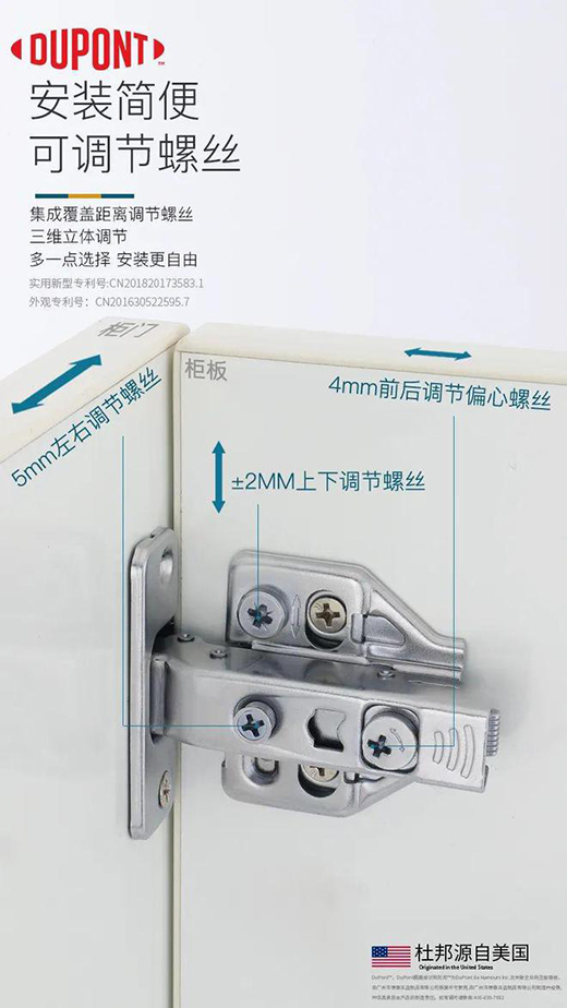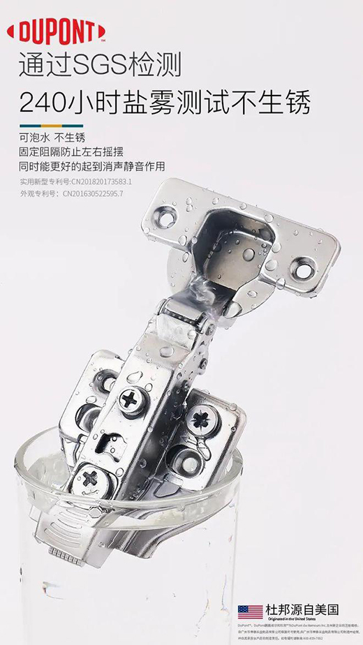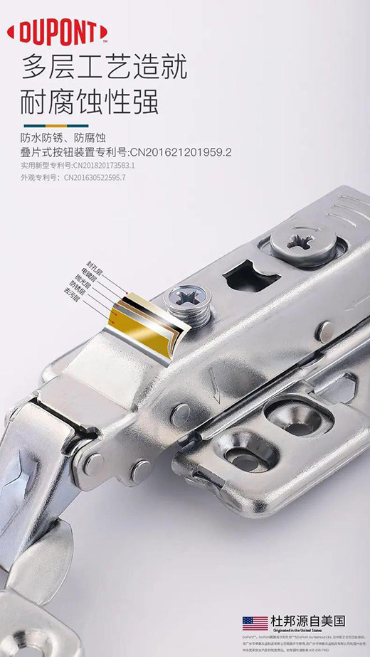 杜邦?五金獨有ALICO創新環保電鍍,通過電鍍后,鉸鏈表層富含含鈦、鋅、鎳等多種微量元素,使得鉸鏈在防銹防腐蝕耐用性能顯著提升。對人體、環境無危害,這是一款環境睦鄰型的鉸鏈。