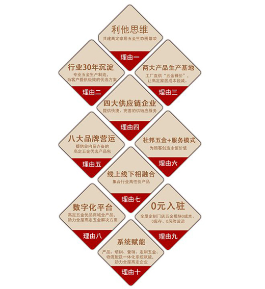 作為一站式五金服務包供應鏈共享平臺,為全屋定制、裝修企業實現零成本、零庫存營銷,助力高定、全屋定制企業及門店、裝修企業吸客、粘客、留客,為全屋定制行業降本增效,共享平臺集采紅利。