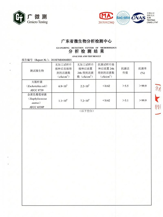 先是對大腸桿菌、金黃色葡萄球菌的研究上取得技術性的突破,經權威機構檢測,在試驗條件下,雅潔抗菌產品對其有99%的抗菌性,符合國家標準GB/T 21866的Ⅰ級標準。