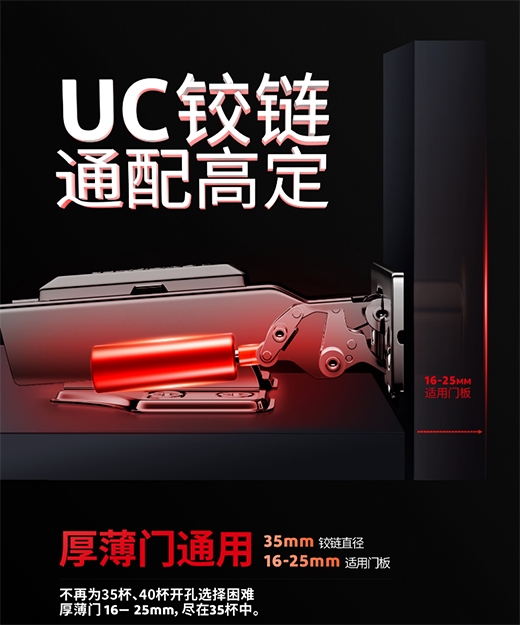 杜邦?五金 UC鉸鏈是一款35杯通用型固裝鉸鏈,讓家居定制不再為35杯/40杯開孔選擇困難,可靈活通用于16-25mm的薄厚門,適配于各種柜體開合角度的構造使用,可提供多種特殊用途的解決方案。