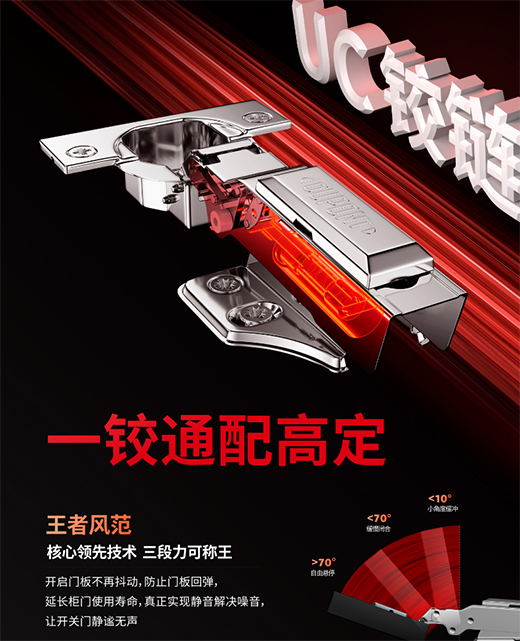 杜邦?五金「UC鉸鏈」是一款三段力設計、小角度緩沖的通用型鉸鏈,它的核心技術則直接代表著行業領先工藝,并取得了實用新型專利和專觀專利,強勢刷新行業標準。它在二段力功能基礎上全面升級,細化了分段力的體現。三段力鉸鏈具備了懸停、閉合、小角度緩沖三個靈活功用,當一段力>70度時,自由懸停;二段力