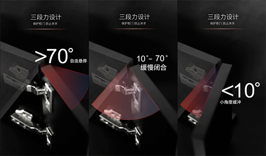 目前家居柜門配備的較常見鉸鏈為一段力或二段力設計,一段力鉸鏈只有全開和全關功能,不僅會出現來回撬動問題,長久使用還會出現木牙螺絲滑絲,松脫等現象,從而影響家具、櫥柜的正常使用;二段力鉸鏈開關自由,通常關門時,在110°-45°范圍內,門板自由停留,小于45°后門板自動緩緩地關上,雖沒有來回撬動問題,但仍存在低噪音問題。
