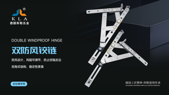 針對高層住戶和臺風天氣頻發的地區,庫勒首創高品質雙防風鉸鏈——后托結構+風阻調節,增加防風墊片,抗風能力達到12級,防止鉸鏈反邊,保障窗扇防風不墜落,呵護居家安全。庫勒五金此款雙防風鉸鏈,開關過程無噪音,而且承重能力強,承重可達50KG。
