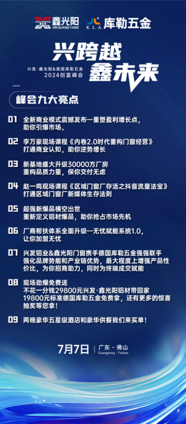 在門窗行業風起云涌的今天,如何抓住機遇,實現跨越式發展?7月6-7日,庫勒五金攜手興發·鑫光陽門窗,共同舉辦“興跨越·鑫未來”財富峰會,為門窗行業注入新的活力與機遇。
