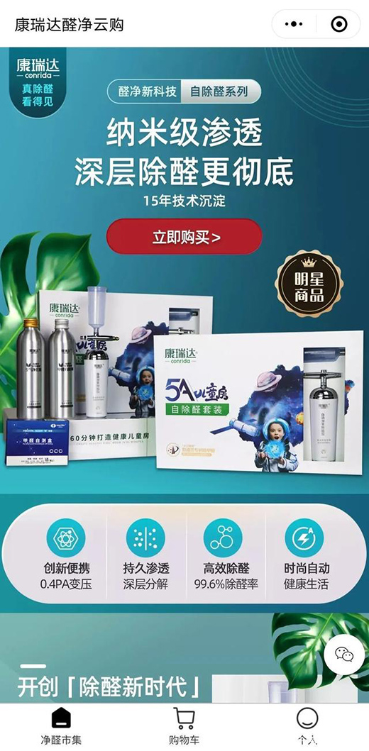 據了解,康瑞達自除醛云商城,以康瑞達除甲醛15年研發成果為基礎,以“自除醛”套裝為主打產品,兼具購買、支付、分銷等功能。在平臺上,消費者不僅可以買到所需的5A兒童房自除醛套裝、4S車內飾自除醛套裝和空氣凈化凝膠等高質量商品,還可以申請成為推廣員,通過分享,獲得高額的分紅,實現雙贏。
