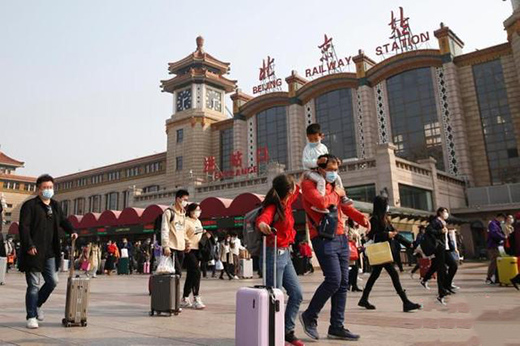 10月7日,旅客走過北京火車站廣場。中秋國慶假期即將結束,北京站客流漸增。