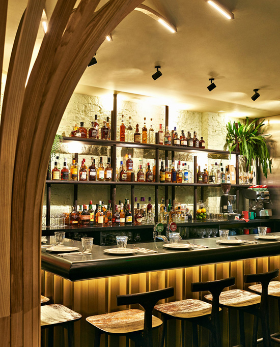 餐廳的酒吧藏有各種不同種類的牙買加朗姆酒,其豐富程度堪稱倫敦之首。為了突出這一特征,設(shè)計師仿照燒焦的收割前的甘蔗地設(shè)計了一款擱架系統(tǒng),用燒焦的木棍作為合板釘穿插在多層擱板中,在微妙的燈光下,琥珀色的朗姆酒瓶閃爍著醉人的光輝。吧臺正面由青銅制成,波狀起伏的形態(tài)同樣也參考了牙買加的建筑特征。