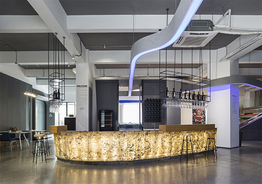 前臺(tái)接待區(qū)與吧臺(tái)設(shè)計(jì)融為一體,為了在建筑材料和設(shè)計(jì)細(xì)節(jié)上別出心裁,吧臺(tái)由天然巖片拼接而成,配以暖色燈光,彰顯公司文化的同時(shí)呈現(xiàn)家的溫暖與朝氣,使得整個(gè)環(huán)境給來往的訪客和員工眼前豁然開朗的視覺感受。