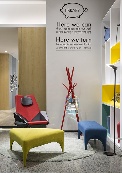書吧根據(jù)書架區(qū)域面積做出功能性分割,分成“圖書展示”和“作品展示”區(qū)。書是主角,大片的雜志書籍象征著設(shè)計(jì)師個(gè)性、賦予時(shí)代性的設(shè)計(jì)理念,而產(chǎn)品點(diǎn)綴著整個(gè)書吧,橘橙色的座椅、亮片pig等都讓整個(gè)場(chǎng)景富有現(xiàn)代氣息。