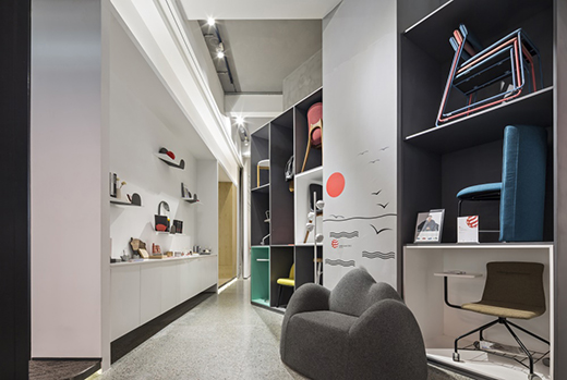 設(shè)計(jì)師將文創(chuàng)展示區(qū)和產(chǎn)品展示區(qū)結(jié)合,讓展示區(qū)域不再單調(diào),形成一個(gè)小型的家居店。產(chǎn)品展示區(qū)主要以灰色格子作為視覺展現(xiàn),在強(qiáng)化空間界限的同時(shí),運(yùn)用綠色格子和白色格子營(yíng)造出具有創(chuàng)意性的視覺體驗(yàn),此外添上色彩斑斕的椅子,構(gòu)成空間色彩妙用的對(duì)比關(guān)系。而對(duì)立面的文創(chuàng)產(chǎn)品區(qū)通過連綿起伏的山掛件展示極具創(chuàng)意的文創(chuàng)產(chǎn)品,同時(shí)表達(dá)企業(yè)追求不斷創(chuàng)新的精神。