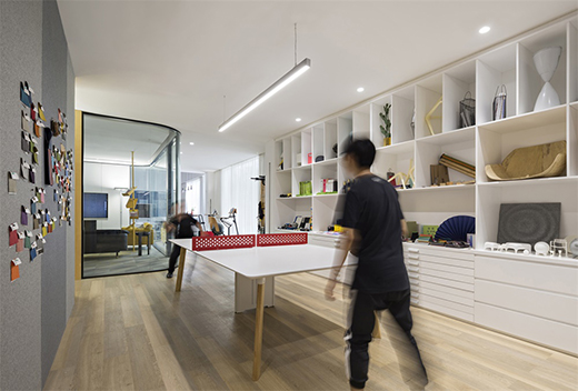 設(shè)計(jì)師對(duì)材料區(qū)進(jìn)行了大膽的構(gòu)思,將原本空曠的中間區(qū)域改造成乒乓球區(qū),不但解決了空間容納度,同時(shí)營(yíng)造出區(qū)域豐富的架構(gòu),讓工作和玩同時(shí)得以實(shí)現(xiàn)。