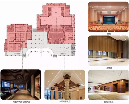 建筑布局呈東西朝向,共分為3大功能區:中區為入口共享大廳,北區為劇院及排練廳,南區為影廳與多功能大廳。建筑內部還設置了餐飲、精品店、咖啡廳、展廳等商業文化設施。這是一座功能復雜、規模宏大的綜合文化中心。