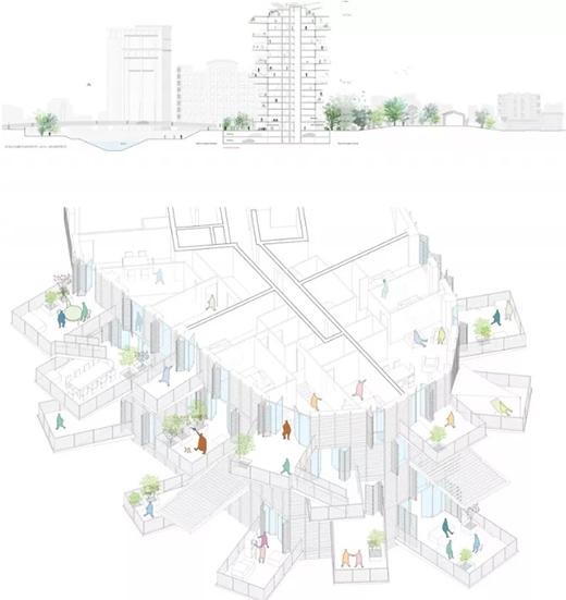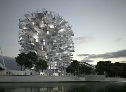 這是日本設計師Sou Fujimoto為法國蒙彼利埃設計的一棟集辦公、畫廊、酒吧與餐廳于一體的綜合性建筑物,全高17層,其最大的特點在于,整個建筑物就像棵大樹般開枝散葉,讓露臺和陽臺狂放地向四周綻放,從而提供相當多樣又實用的戶外空間。