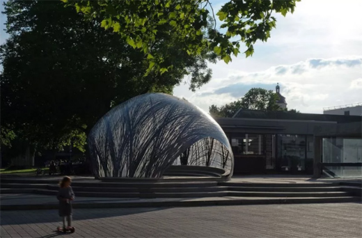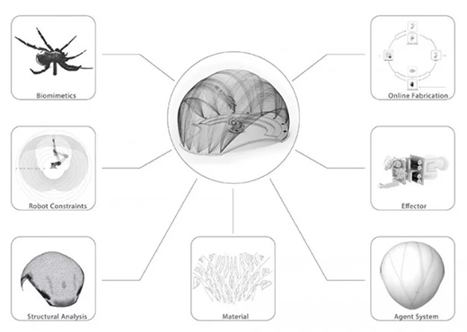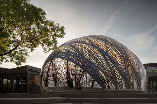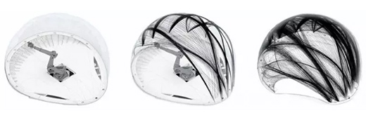 整個亭子是在一層柔軟的薄膜內部用機器人織上可以增強結構的碳纖維而形成的輕型纖維復合材料外殼構筑物,同時這種建造方式使用到最少的材料實現了結構穩定性。