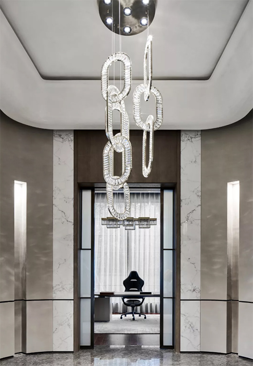 落落大方的門廳以極簡的金屬質感為主調,“少則得,多則惑”的東方辯證哲思為內在氣韻,使人進門便感受到優雅而大氣的空間氣場,設計感極強的吊燈賦予了門廳別樣的幾何線條,方圓之間,自由天地。