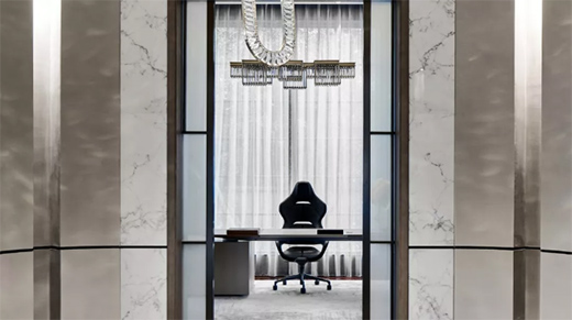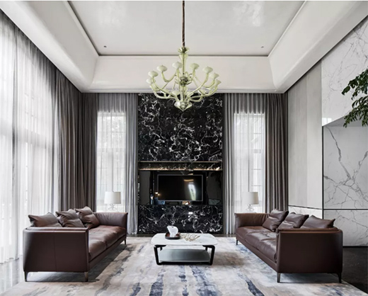 門廳正對著的是空間開闊、窗明幾凈的會客廳。沉穩的皮質沙發搭配質地清晰的大理石背景墻,地毯柔和的紋路綜合了空間的剛硬,與淡綠色透明吊燈一起,為空間增添了幾分活力。陽光透過柔紗窗簾輕拂在會客廳內,賓客與屋主得以細語交談,賓主盡歡。