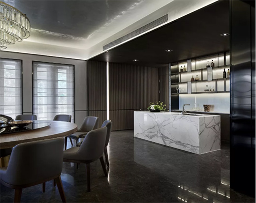 通過一扇拉門,進入餐廳。塞浦路斯灰大理石地面沉穩而時尚,一側的調酒吧臺彰顯了屋主的格調,圓形餐桌符合中國人飲食習慣,吊頂與吊燈更是在用餐其間為圓滿融洽的氛圍述刻了形狀。